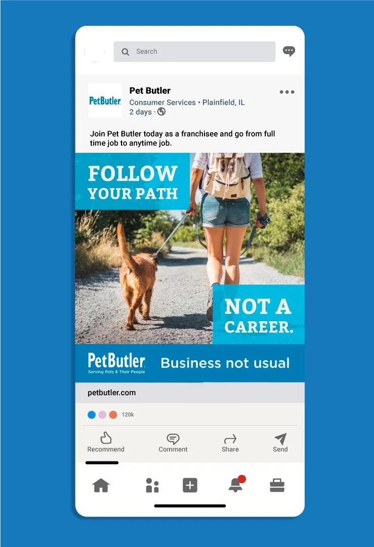 Pet Butler–a franchise service that helps customers care for their pets–needed help with outreach and finding a target demographic who would be interested in starting their own Pet Butler franchise businesses. With their budget, we came up with a strategy targeting potential franchisees through organic social and paid ads on LinkedIn.